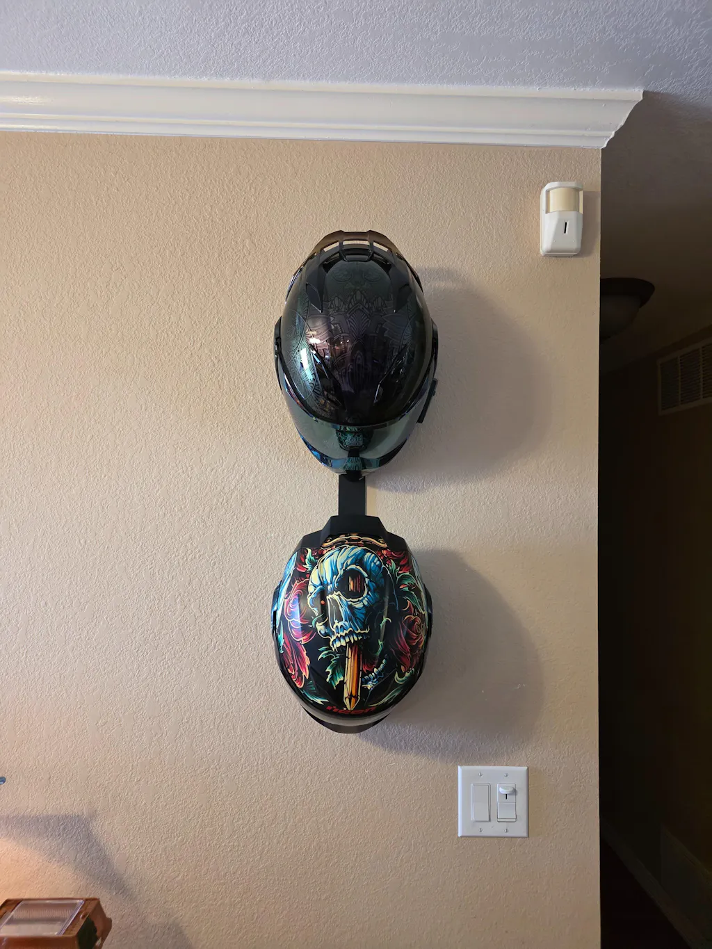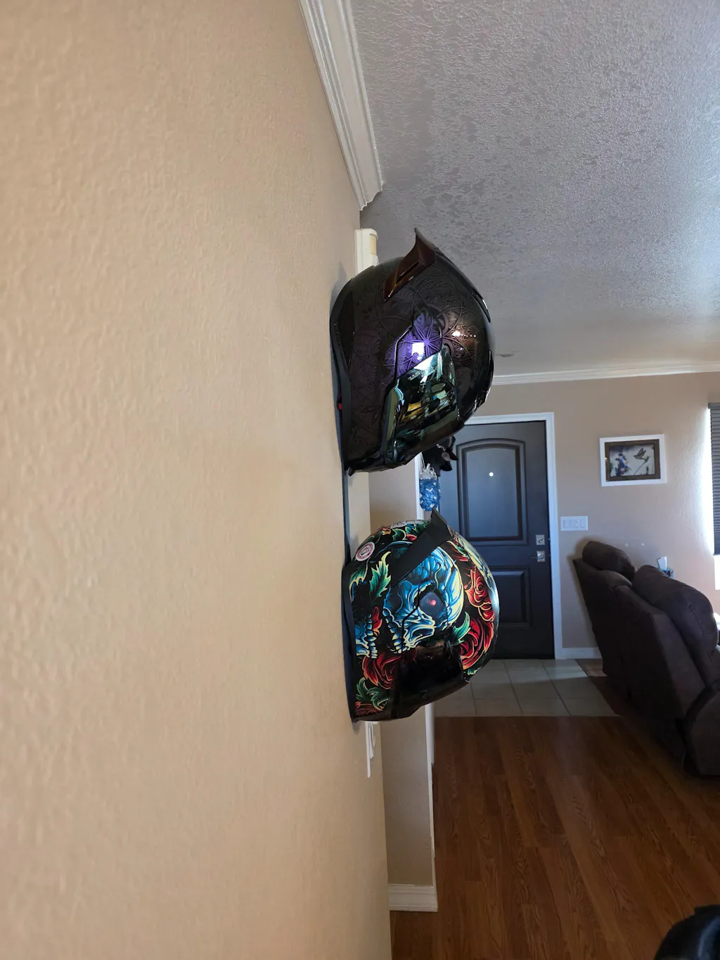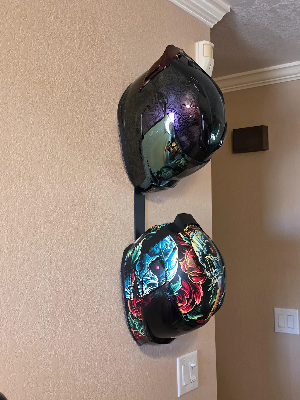 This is a very sturdy and well made product to hang your helmets! It looks nice and allows you to display your cool helmets like they should be. I would definitely recommend this product.