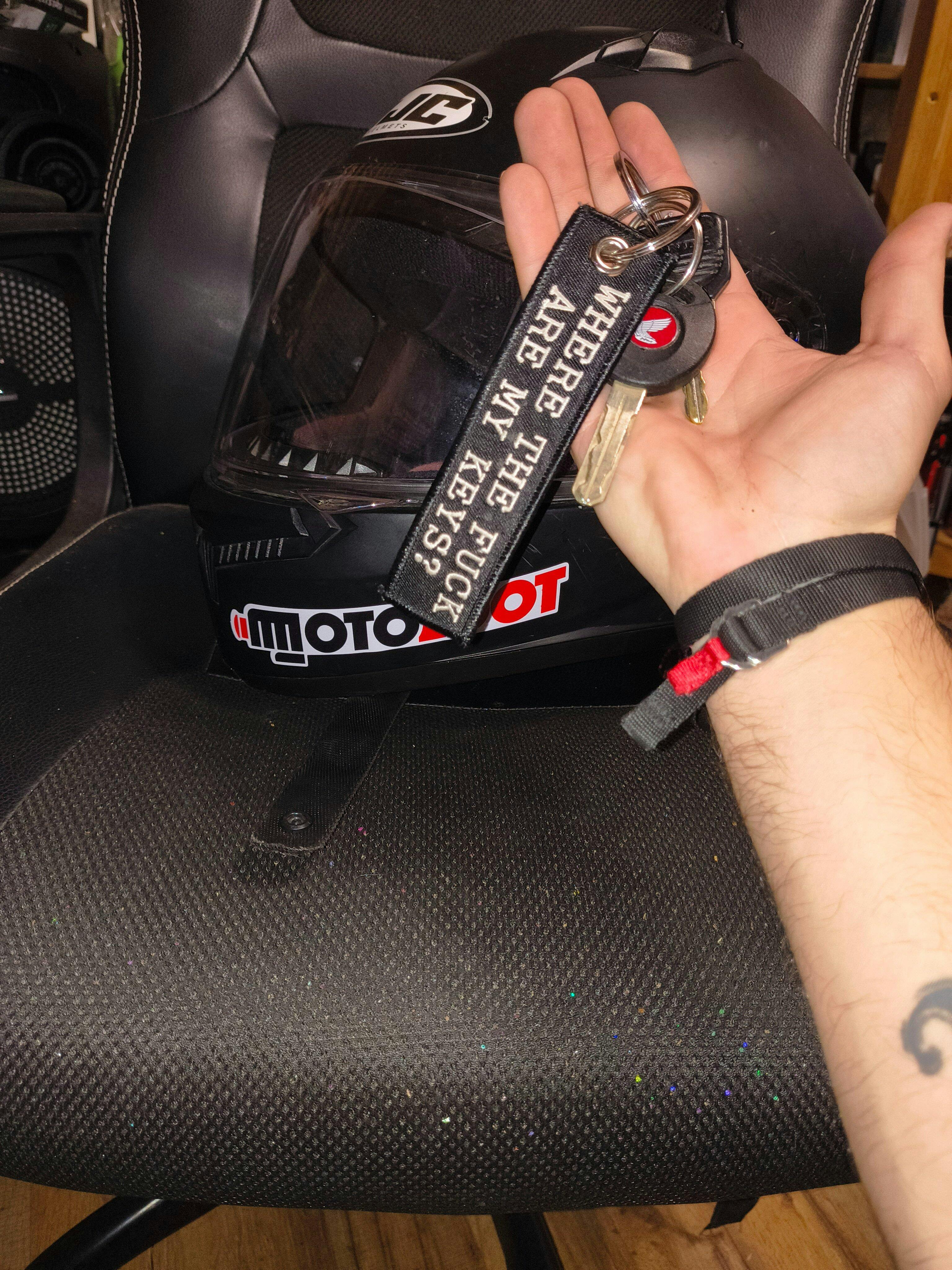 • "Where The Fuck Are My Keys" embroidered on both sides of the tag