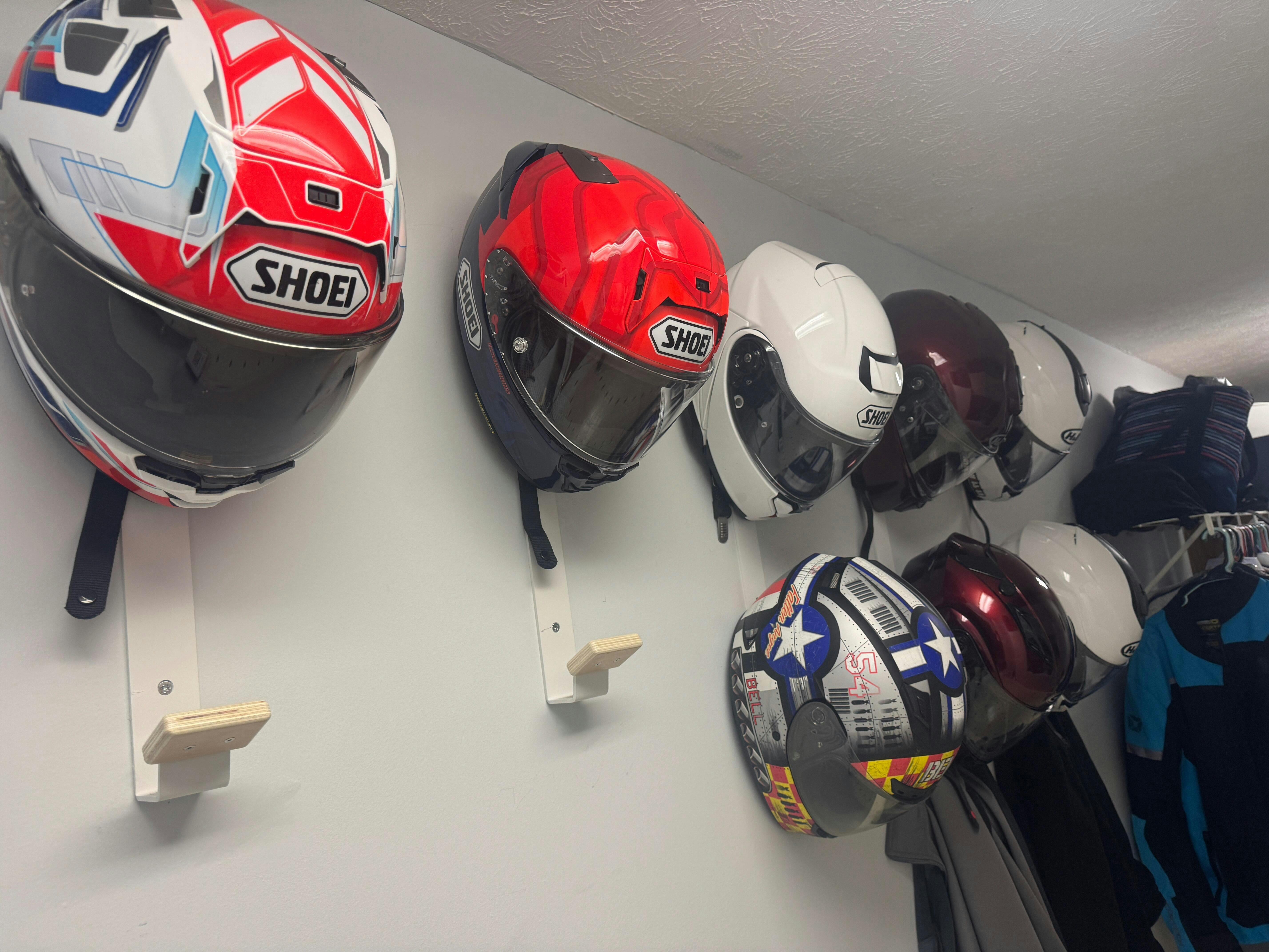 2. Innovative helmet hook design securely and aesthetically holds your helmets. Ours is specially designed to sit flat against the inside back - just like your skull would. This aesthetically holds your helmets flat against the wall and has no risk of it falling off.