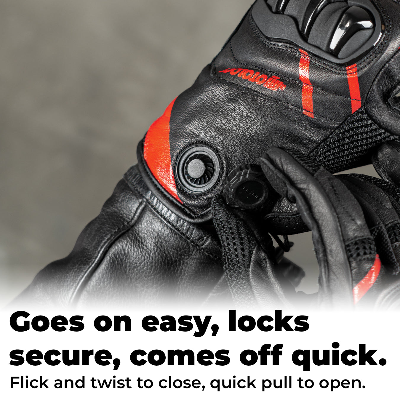When you’re not wearing them, the magnetic clasp lets you stick your gloves to a tank, toolbox, rack, or tailgate.
