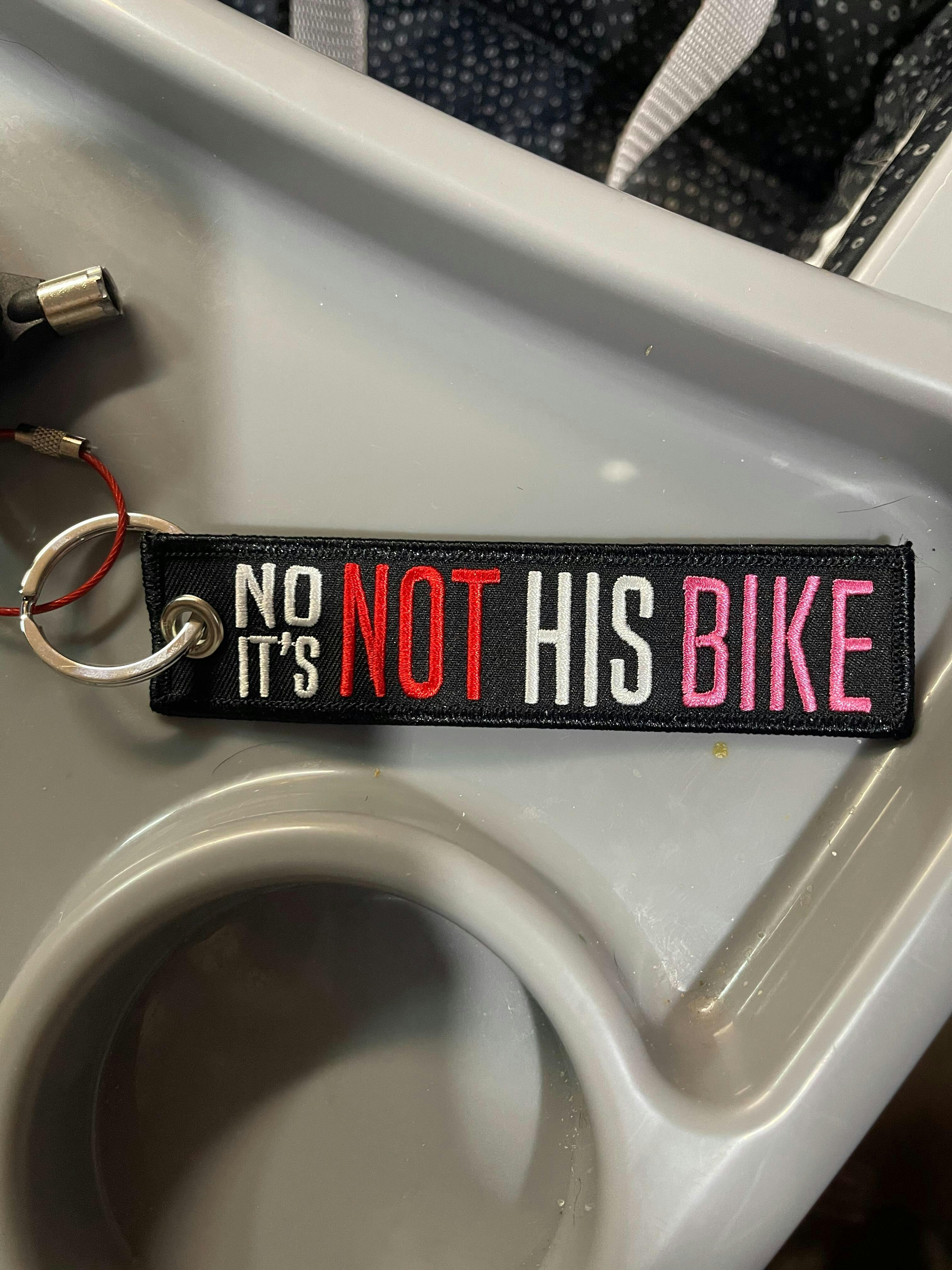 Ladies, do you ride your own bike but get sick of people asking if it's his? Well here's the perfect motorcycle key tag for you!